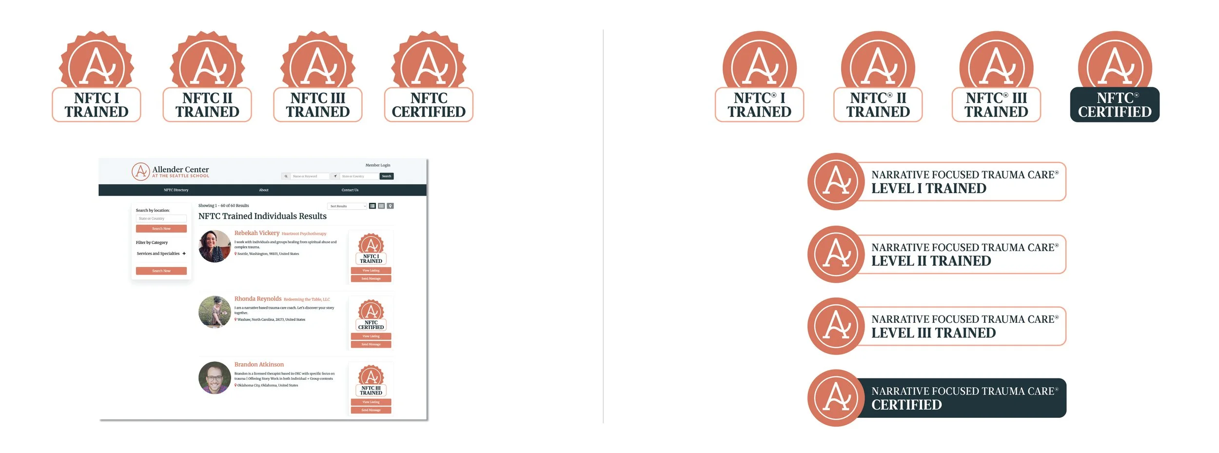 certification badges: set of badges (proposed and approved) to signify training levels for the NFTC Directory, a free resource to find and connect with professional therapists, counselors, individuals involved in ministry, community advocates, and more – all of whom have received various levels of training in Narrative Focused Trauma Care